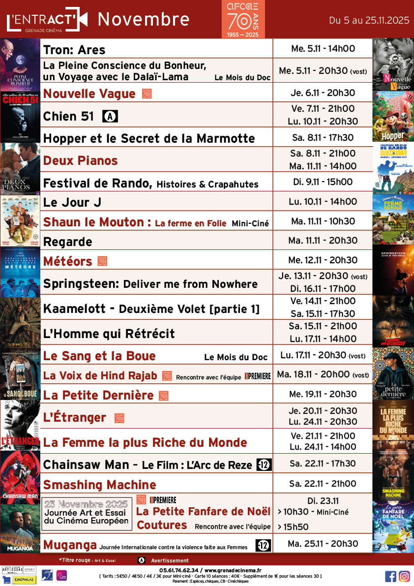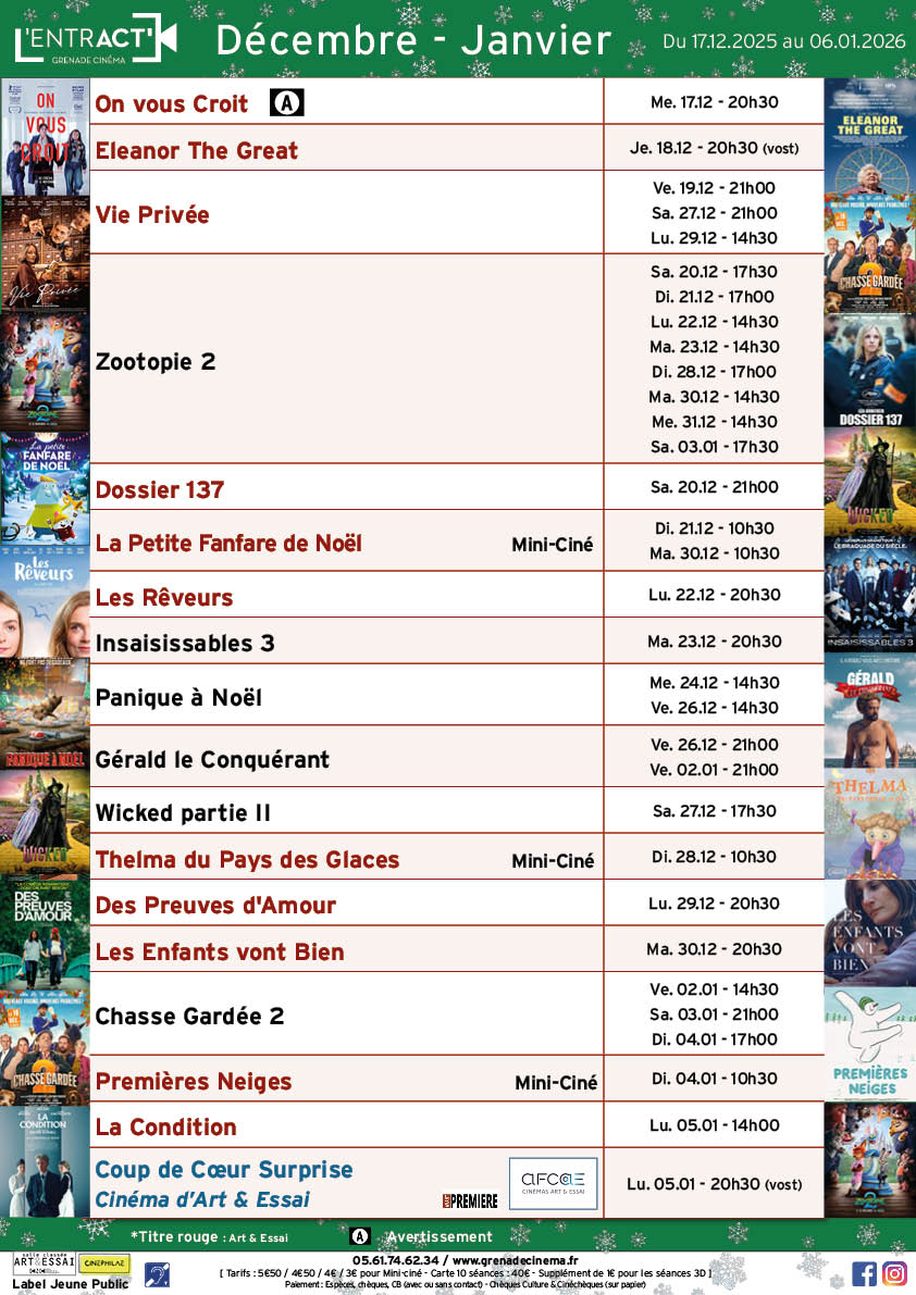 La salle de cinéma l’Entract’ est gérée par les bénévoles de Grenade Cinéma, association loi de 1901 à but non lucratif. La salle est classée Art & Essai et bénéficie du label Jeune Public.